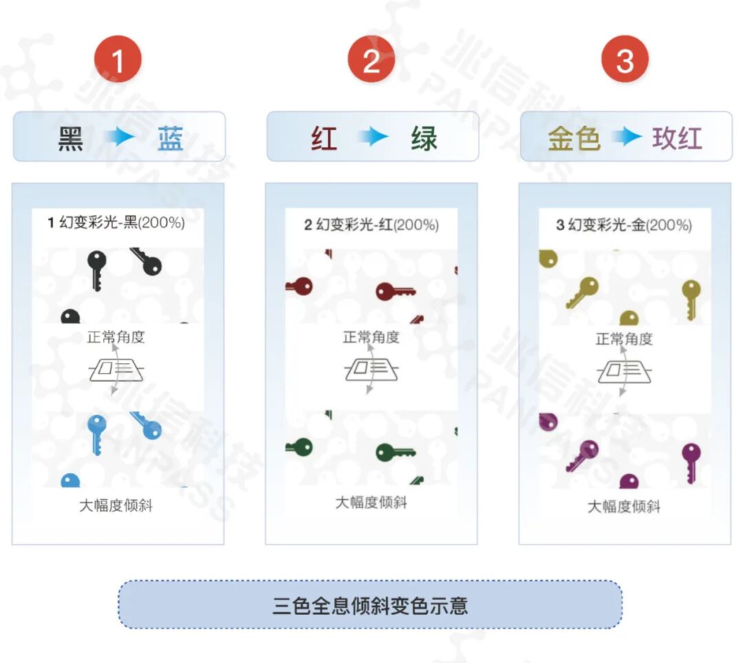 ? 消费者在正常角度观测时,可以同时看到黑、金、红三种颜色,当发生大角度倾斜,会出现颜色变化。