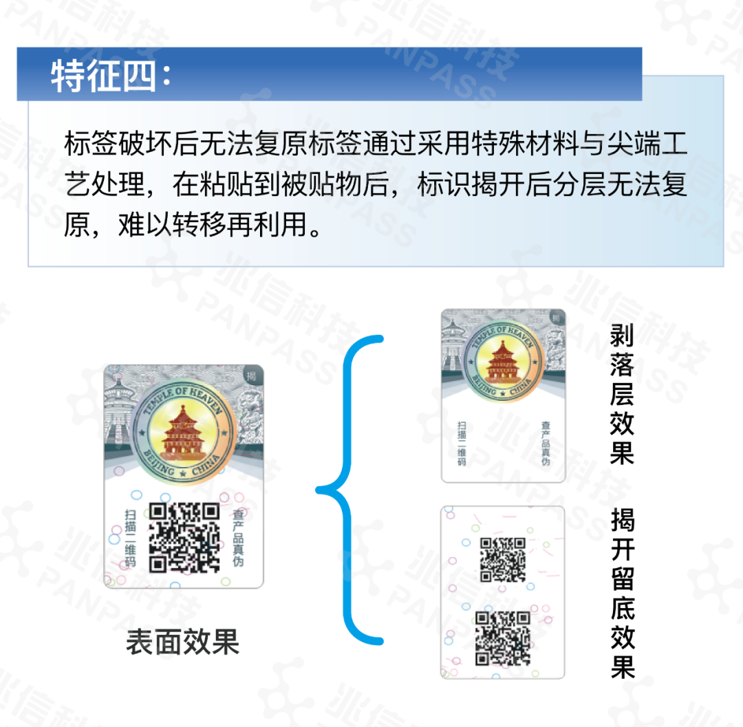 极强的防转移特性:得益于特殊的一次性粘合结构,标识在受到剥离力时会产生不可逆的损伤性分离。部分内容会强制性地残留在物体表面,而揭起部分则永久失效,从而确保标签无法被完整转移或重复利用,有效应对回收真包装造假的行业难题。
