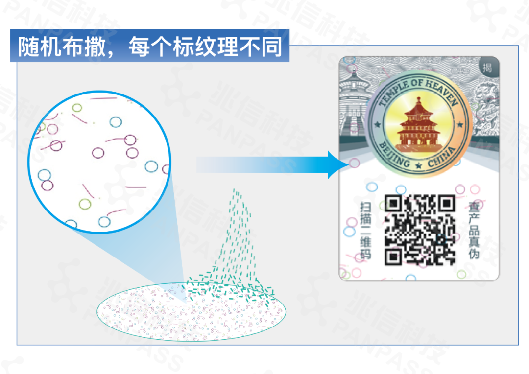 静电随机布撒:利用物体难以再现的随机特征现象,在静电场下对纤维进行随机布撒,纤维分布自然形成,非人为制作,不可仿制,并且不可自行复制,单枚标签纤维分布重复概率低于10??;