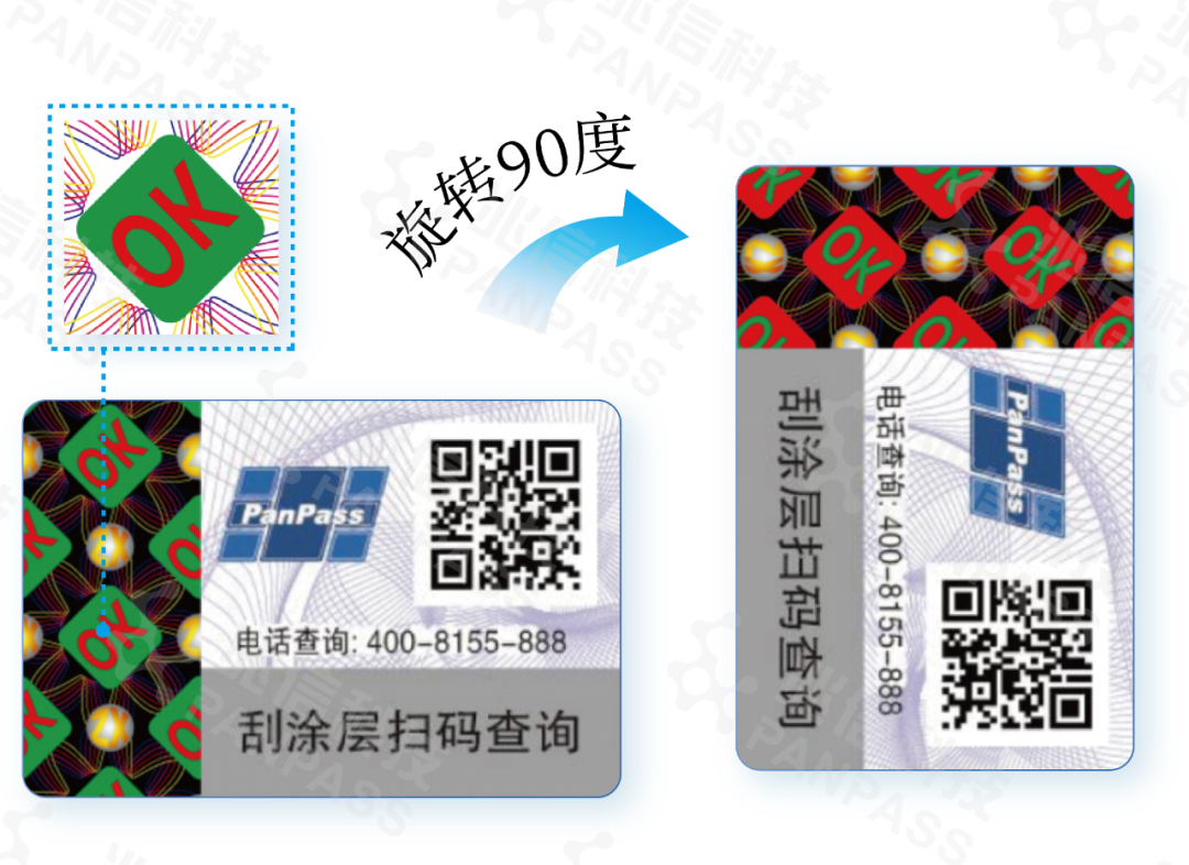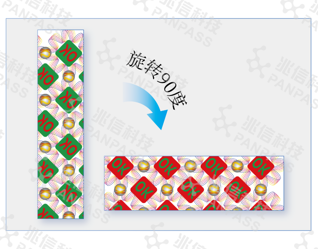在视觉观察下,图案90°旋转,主图案与背景发生红—绿色相跃变,视觉效果生动明显,识别直觉性强,无需专用光源或设备。