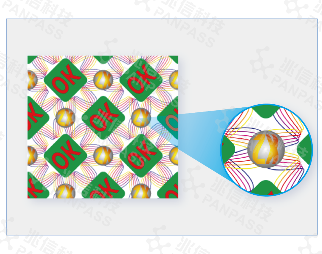 在强光环境下,可通过肉眼或放大镜观察到光学球面上隐藏的“ZX”英文字母,晃动标签时字母呈现立体球形动画效果。光学圆球呈现出晶莹剔透的猫眼视觉效果,提升标签整体美感和科技质感。