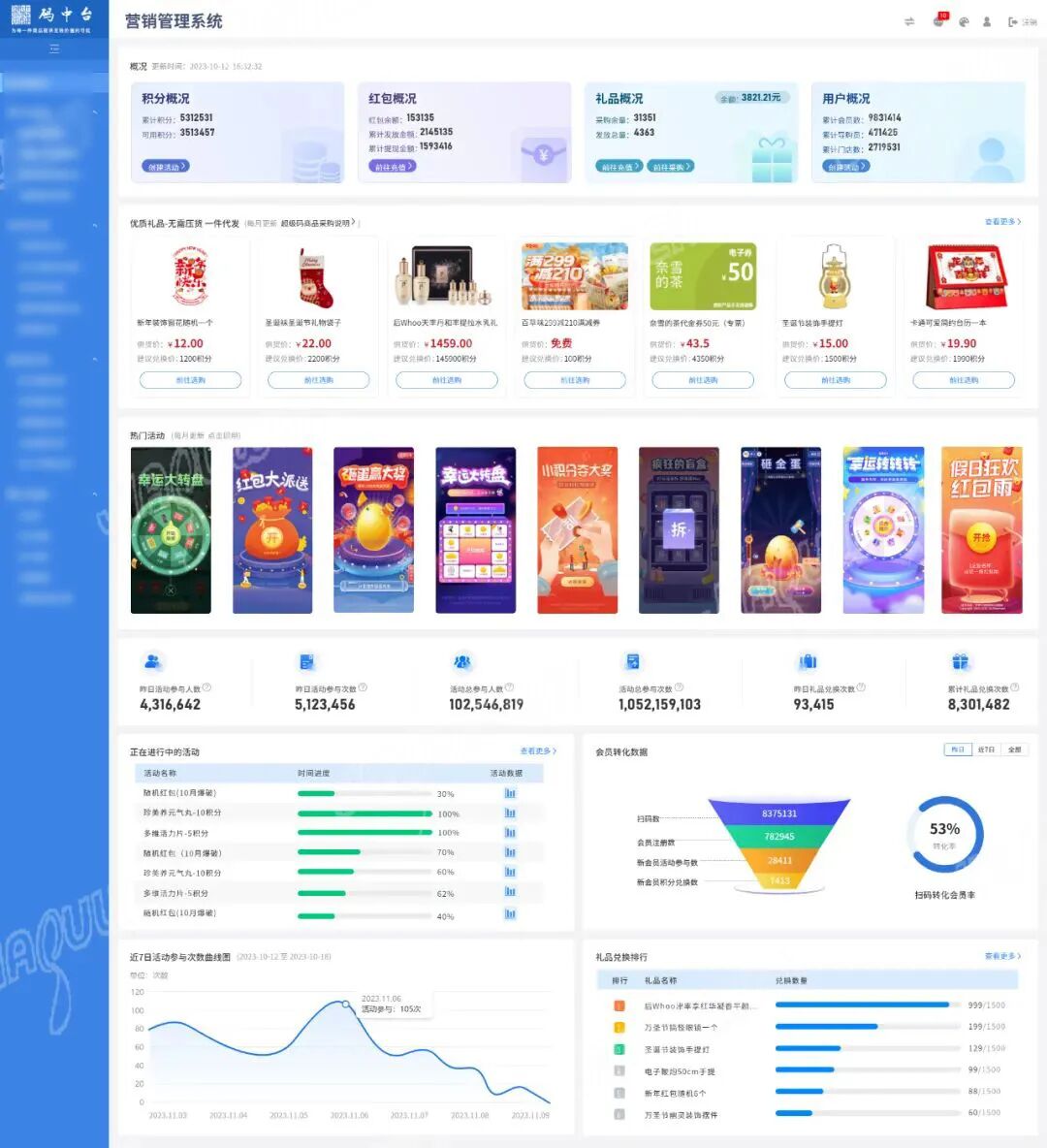 企业可选择模板进行动态配置,实时更新,通过”奖品+活动“的形式,实现低成本引流,引爆c端,提升消费者购买欲望。活动发布后,用户可在营销首页管理积分、红包、礼品及用户概况,查看正在进行的活动、会员扫码转化数据、礼品兑换排行榜等数据,助力企业实现快速铺货、精准引流、自动返利,达成销量提升、成本降低、费用透明等效果。企业只需配置营销活动,即可在码中台礼品库一键选购兑换商品,由超级码中台进行奖品发放以及售后维护,一键选购无需售后。