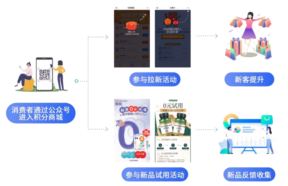 通过会员扫码领奖实现私域引流用户池搭建,通过日常任务、成长激励等促进消费者多次复购;通过新品试用、问卷调研等助力企业进行新品研发;导购营销