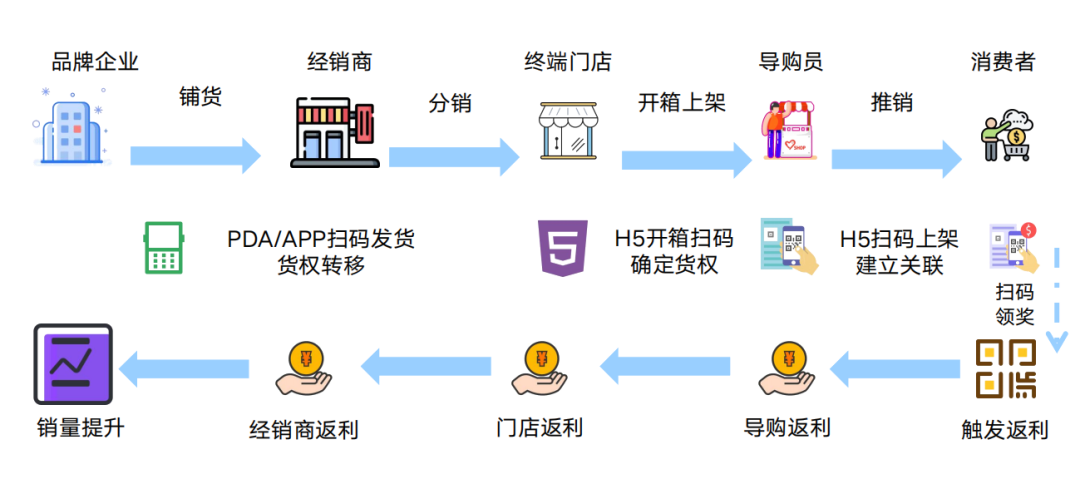 防窜货营销管控体系,通过扫码发货实现人货关联、售出获奖,提高代理扫扫码发货意愿;通过线上产品电子手册、在线订货等,实现订货物流一体化;