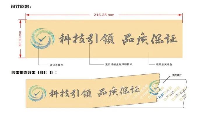 物理防伪技术是一种广泛应用于商品包装、物流运输及防伪领域的重要防伪手段,物理防伪技术通过材料的特殊物理特性来实现防伪效果。物理防伪胶带的代表产品是防揭防伪胶带,防揭防伪胶带的核心功能是在开启或撕开时,能够在包装表面或胶带自身留下不可逆的痕迹或标识。这种胶带通常在撕开后无法恢复原状,揭示出明确的防伪标识,从而提示用户包装已经被打开或篡改。例如:安全揭示型胶带,当胶带被揭开时,会在包装表面或胶带自身出现预设的文字、图案或符号(如“VOID”“OPENED”)。这些标识一旦显现,无法还原,清晰表明包装已被打开。