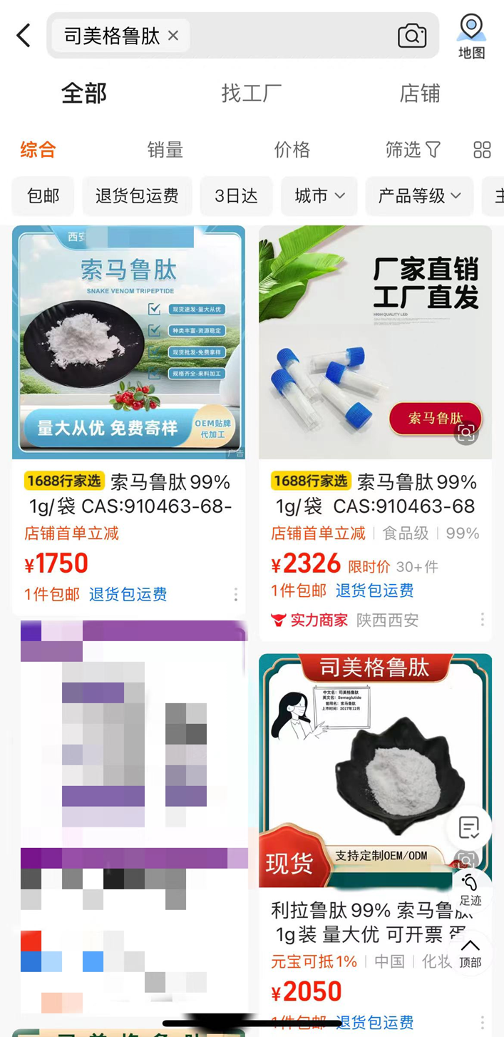 新京报记者调查发现,在互联网上,通过“代工厂”自制一款类似的“冒牌司美”每盒成本不到20元,这已形成一个完整的产业链。而更有违法者,在互联网上售卖司美格鲁肽原料,生产销售未经审批的司美格鲁肽针剂。